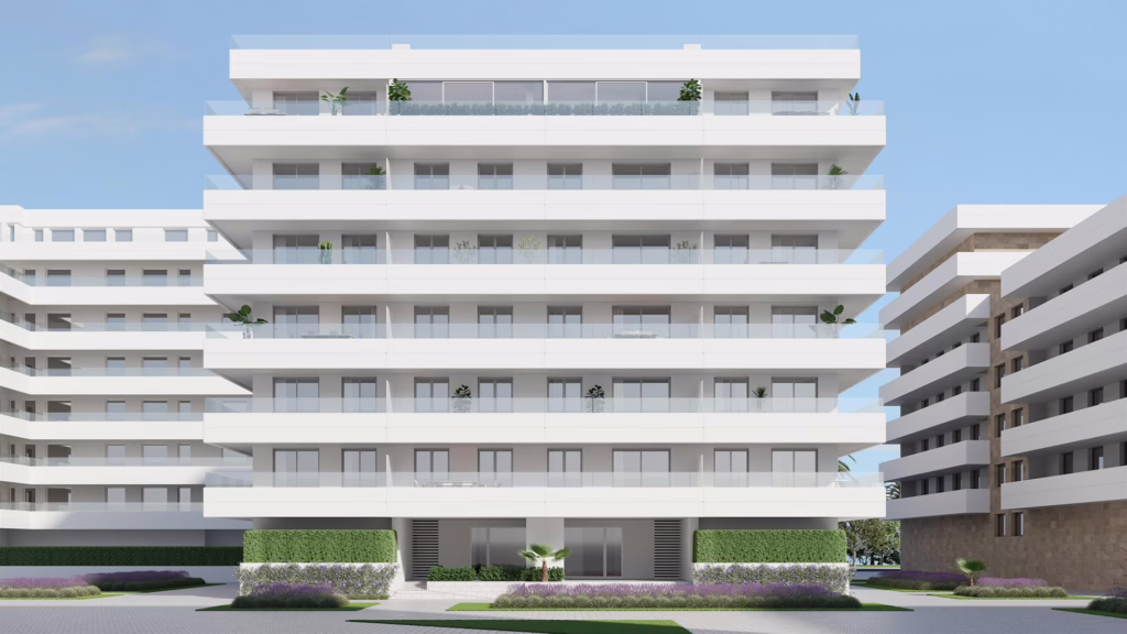 Wooncomplex aan het strand. Flats en penthouses met grote, lichte ruimtes en spectaculaire terrassen van meer dan 20m2 in de meeste woningen, die met hun glazen balustrades een prachtig uitzicht bieden. Elke woning heeft binnenruimtes die perfect zijn verdeeld om op te gaan in de omgeving waarin het ligt.